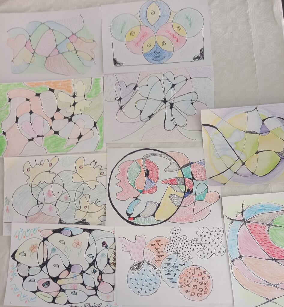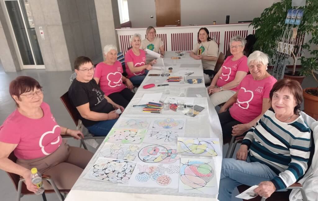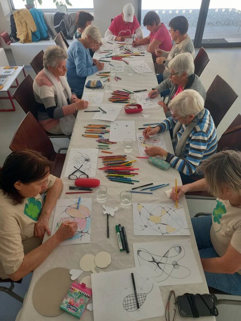 Kromě známých a obvyklých lázeňských procedur (s příjemným a vstřícným personálem) zaměřených na dýchání a pohybové ústrojí jsme měly dvě překvapivá setkání v nově zrekonstruovaných Slunečních lázních. V neděli to byla skupinová arteterapie cesta ke zklidnění, odpočinku a relaxaci. Přes obavy, že nezvládneme nakreslit něco smysluplného, všechny jsme to zvládly. Byly jsme až překvapeny co dokážeme vytvořit ze zpočátku jednoduchých vlnovek na bílé ploše barevnými pastelkami. Vložit do obrázku to, co máme v nitru a o čem nevíme, k tomu nás přivedla úžasná paní arteterapeutka Andrea Zacharová. Bylo to pro nás po všech stránkách obohacující.