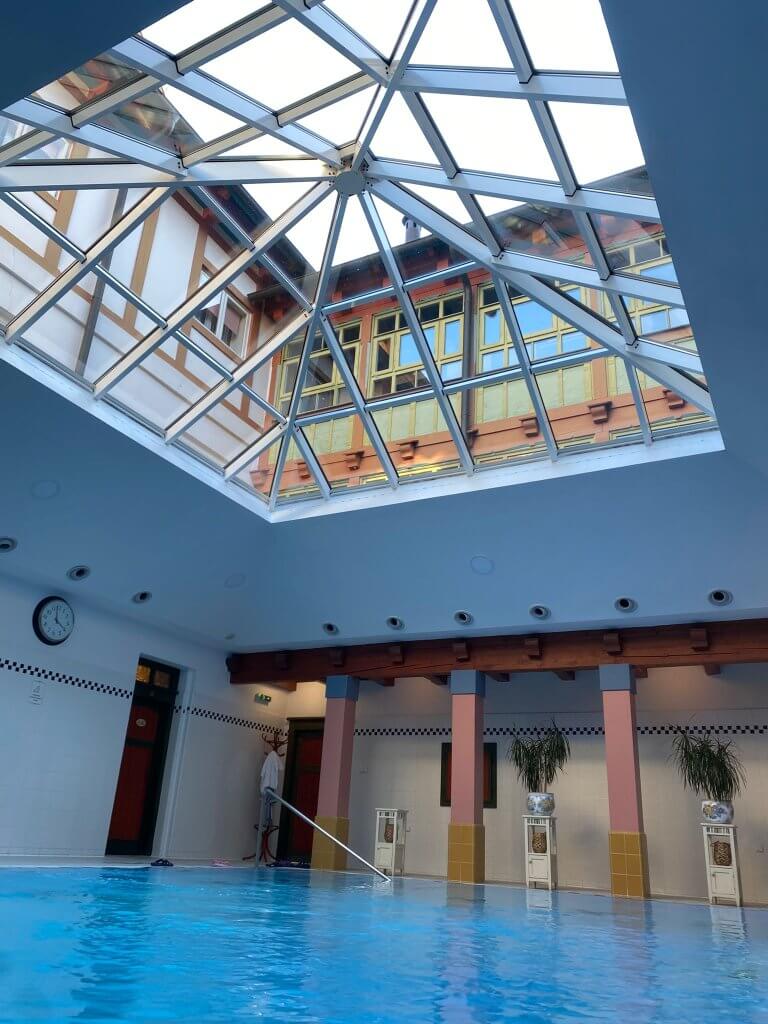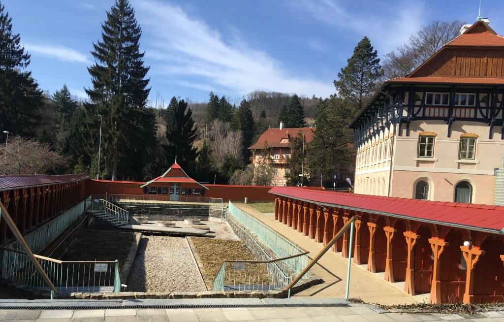 Druhý den jsme hned zahájily procedurami. Výhodou bylo, že bylo vše „pod jednou střechou“ – nadstandardní stravování (vydatné snídaně, velký výběr jídel večer a ještě malé polední občerstvení), příjemné prostorné pokoje, místo pro setkávání nás Alenek a hlavně možnost v župánku přejít na klasickou nebo relaxační masáž, rašelinový obklad nebo oxygenoterapii. Jen k minerálnímu prameni Vincentka jsme se rády pěkně oblékly a prošly. Velmi příjemné bylo plavání v teplé vodě krásného bazénu v Jurkovičově domě s výhledem na nebe prosklenou střechou, s masážními tryskami a vířivkou.
