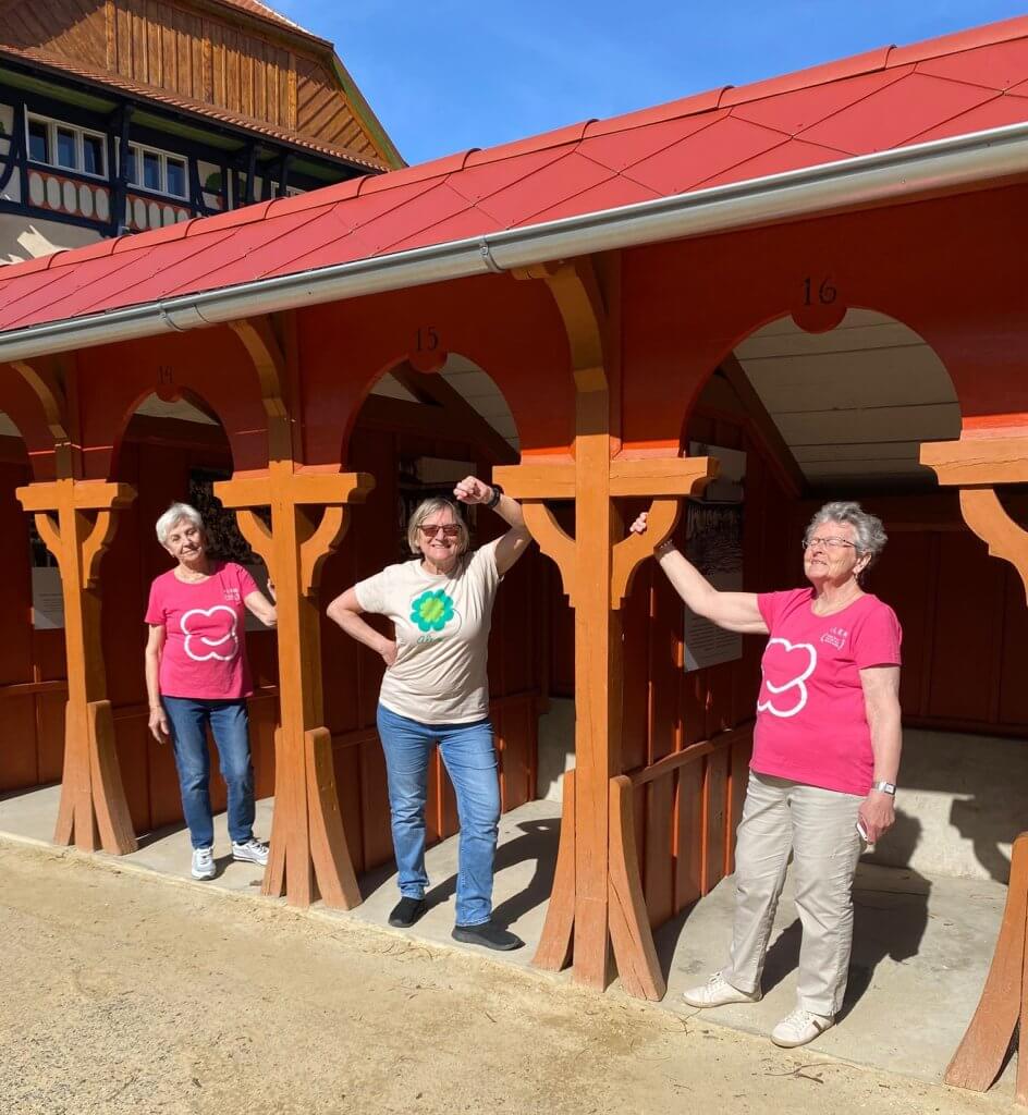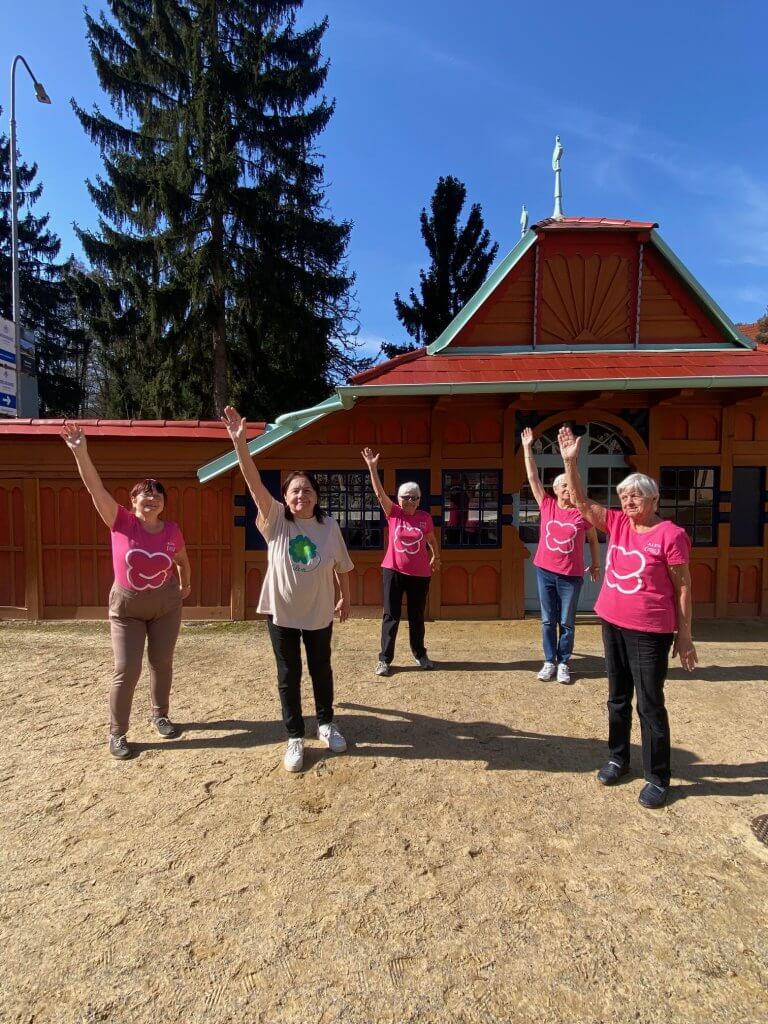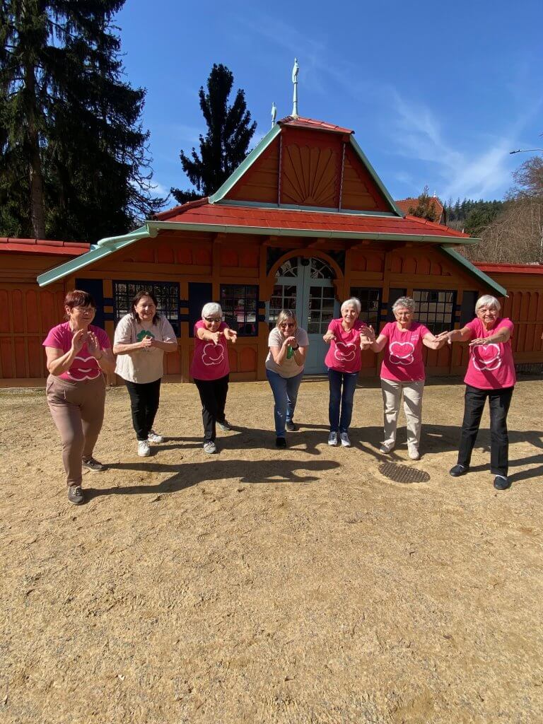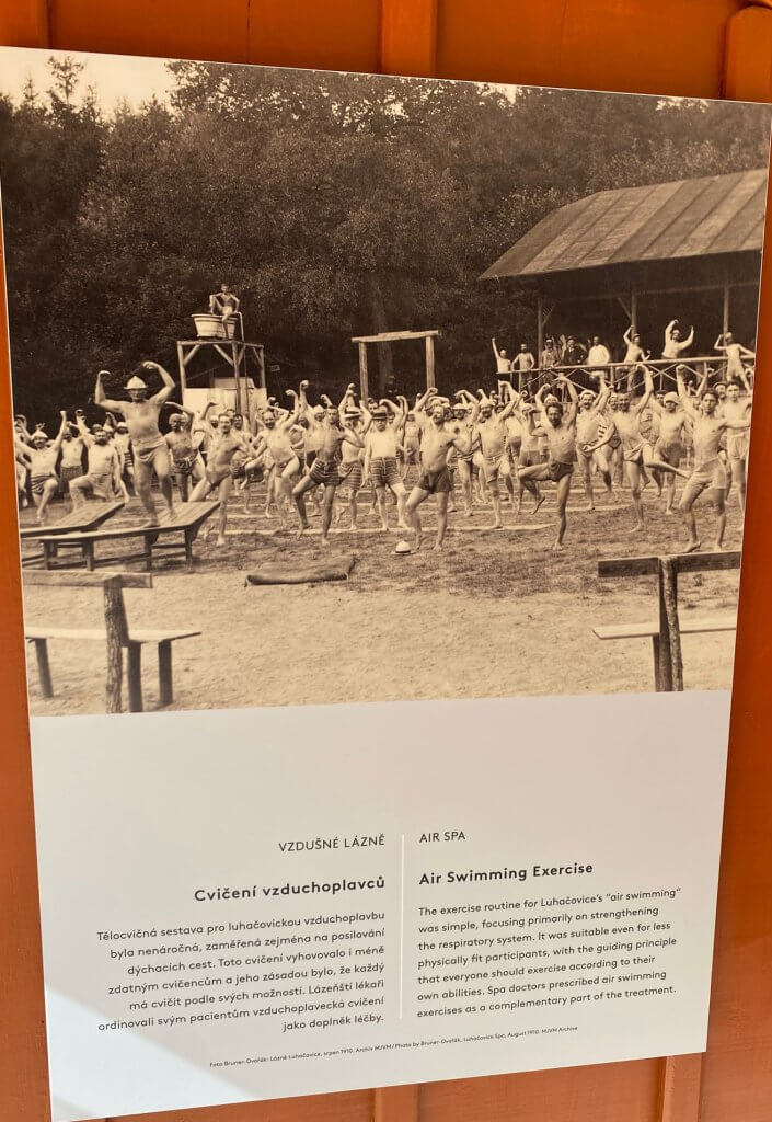 Na terapii jsme přišly v alenských tričkách, protože následovala „vzduchoplavba s Irenkou.“ Prošly jsme se po Vodoléčebných lázních, prohlédly si bazén bývalých říčních lázní (přestavěných D. Jurkovičem z Jestřabského mlýna) a zajímavé kabinky kolem a potom si zde vyzkoušely „staré časy“. V prvních letech 20. století se sem chodili opalovat dámy a pánové a užívali si tzv. vzduchoplavbu – nenáročné cvičení zaměřené na posilování dýchacích cest. Zásada je cvičit dle svých možností. A to jsme také pod vedením Irenky udělaly.