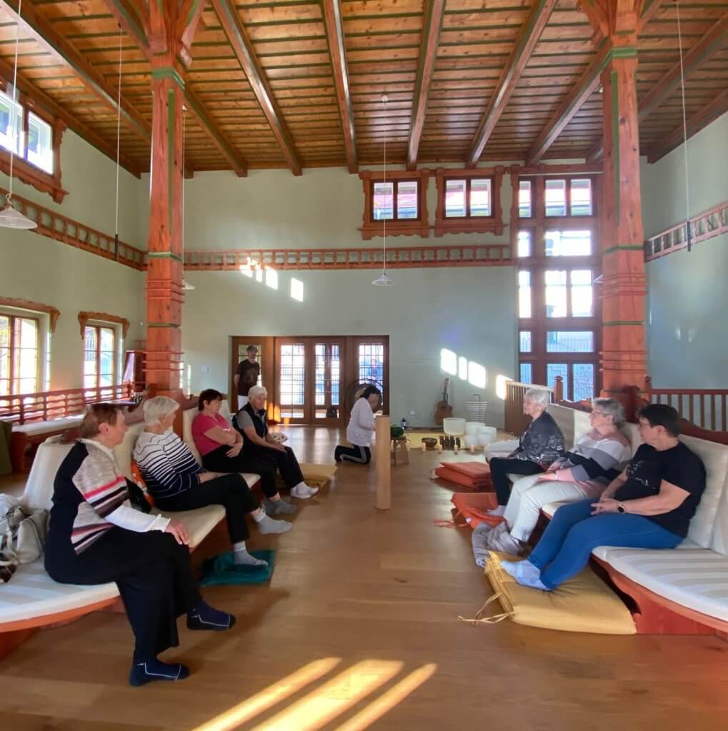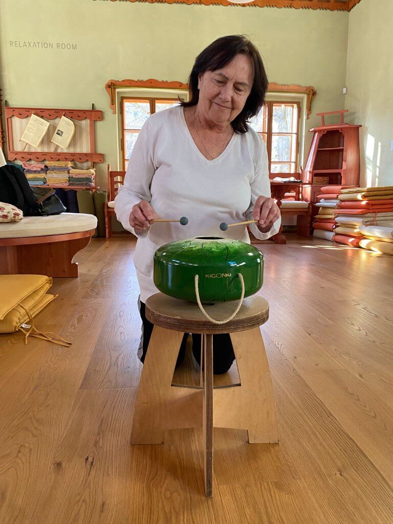 Druhé setkání nás čekalo v pondělí – skupinová muzikorelaxace v Jurkovičově odpočívárně – harmonizace těla a obnova energetické rovnováhy – se sympatickým muzikantem a terapeutem, který nás (některé vsedě, některé vleže) uklidňující hudbou a zvuky zvláštních rozličných nástrojů příjemně zklidnil. Jen Zdenu naopak vyprovokoval k samostatným pokusům o vyluzování tónů na neznámých nástrojích.